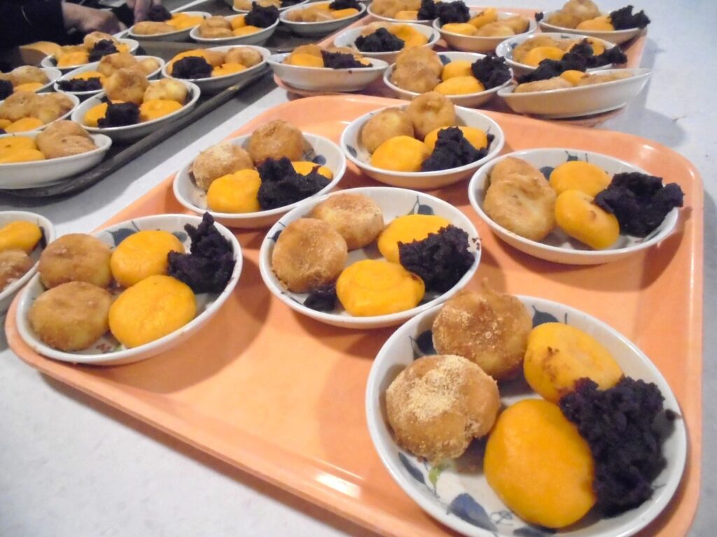 20gくらいに丸めたお団子を茹でて、サツマイモには「きなこ」。かぼちゃには「こしあん」をつけていただきます。